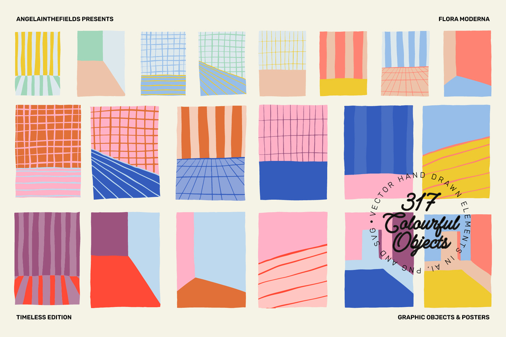 The romantic notion of spring florals mixes with painterly shapes, wonky lines and carefully chosen colourways. Perfect for building your own posters, branding, social media templates and more.