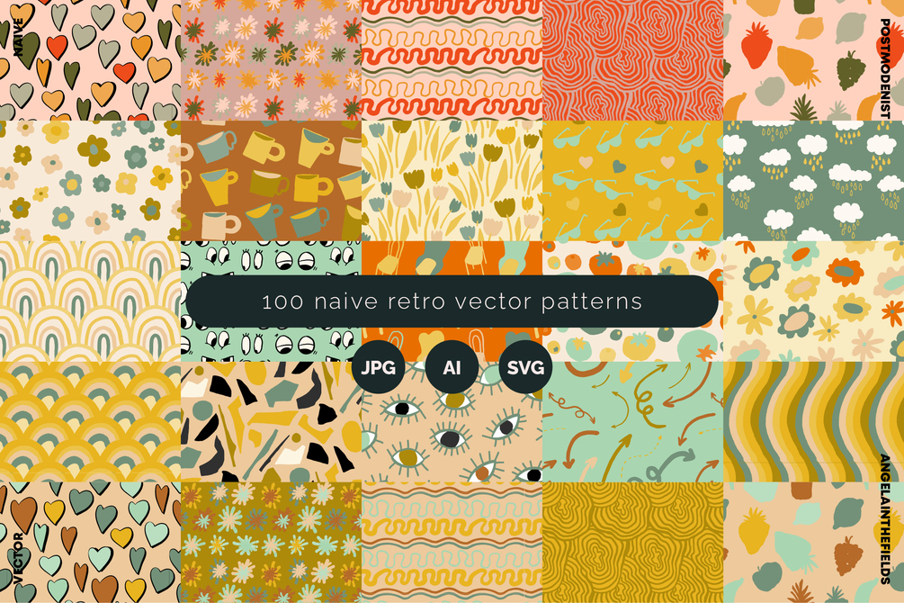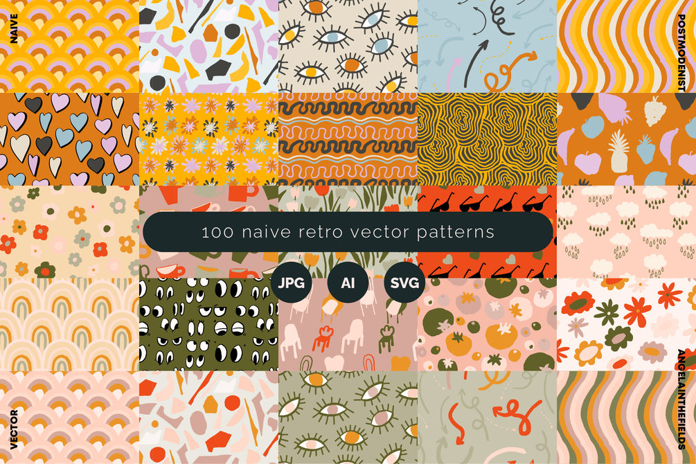 This collection is a continuation of my Naïve Library (clipart + posters set which you can find in my shop) and it includes the same bright, funny tone of wonky elements and fresh colours. Easily incorporated with big bold fonts and daring colour schemes, the patterns are completely vector and therefore very easy to edit.