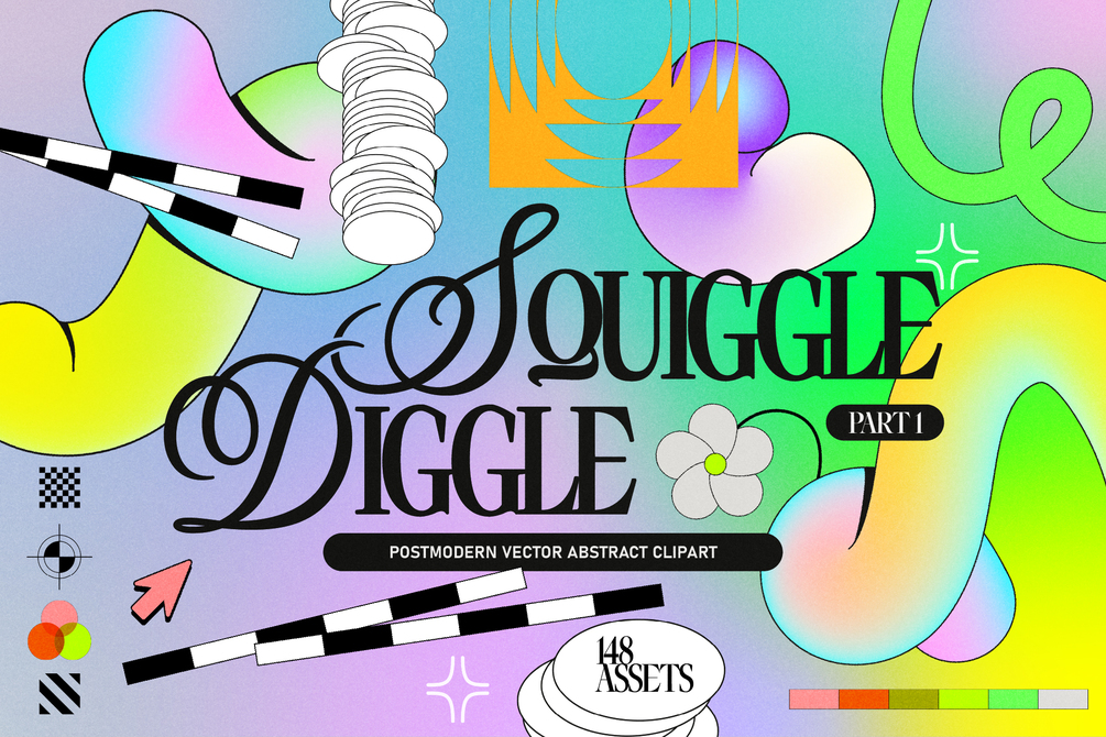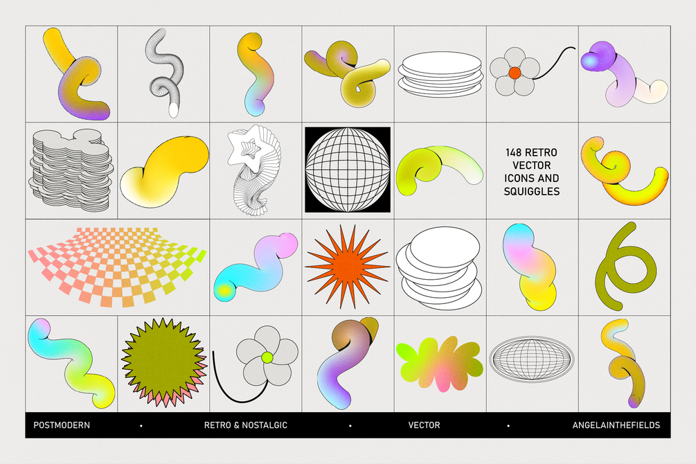 Squiggles ahoy! Fun, giggle inducing and hyper colourful doodles with a healthy amount of complimentary graphics to make them really pop - this vector kit will be your go to tool for all your 80s/90s & post modern inspired projects.