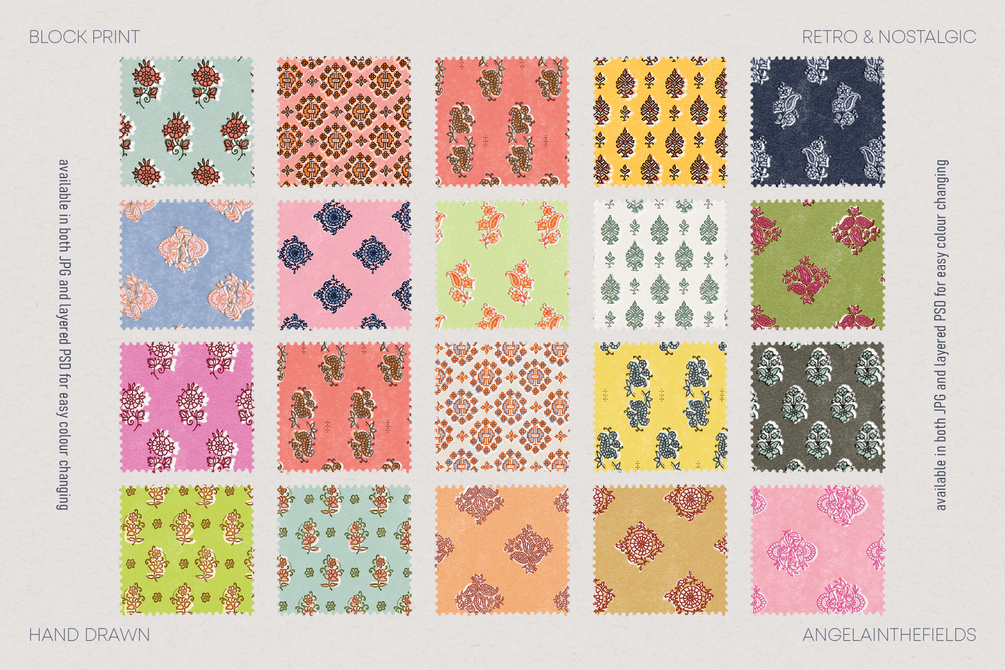 Introducing Bombay Summer —a curated collection featuring 20 block print-inspired retro patterns. Dive into a world of timeless design, where organic shapes and rich print textures come together in a vibrant vintage color palette. Elevate your branding, social media, or products with these effortlessly chic patterns that capture the essence of summer.